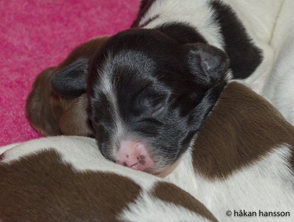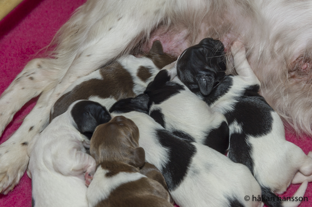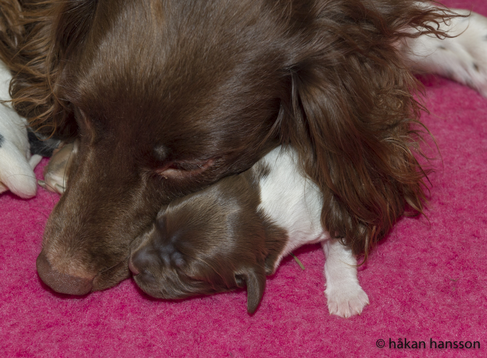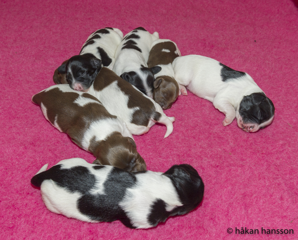 För en vecka sedan kom de – Diva o Pepper efterlängtade småttingar. En fullständigt okomplicerad och med spanielmått extremt snabb valpning – endast 2 timmar – gav sju finfina starka valpar.