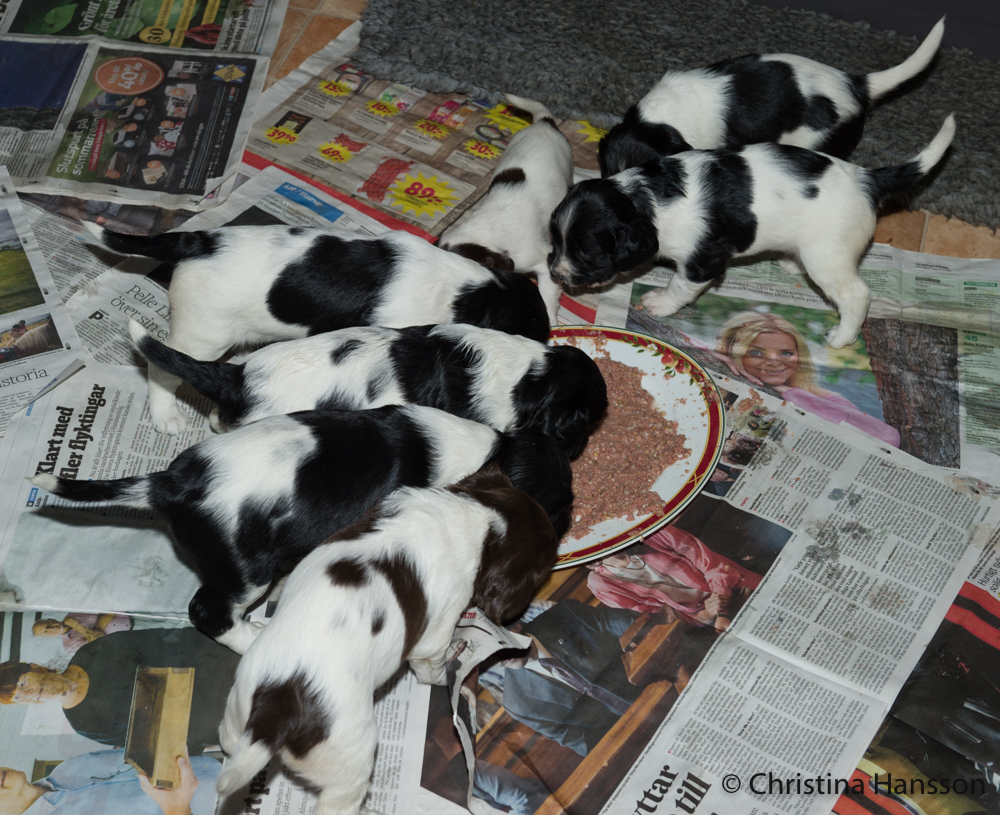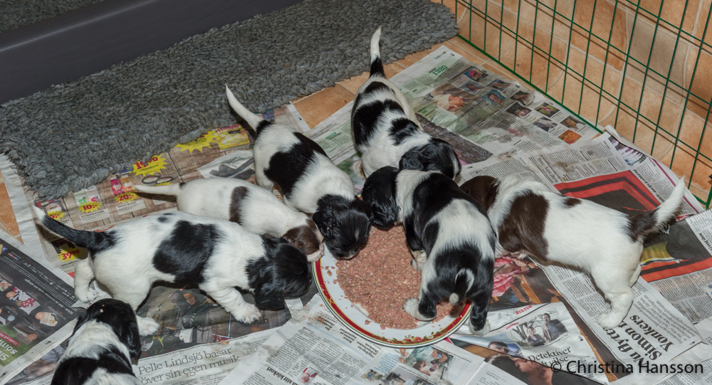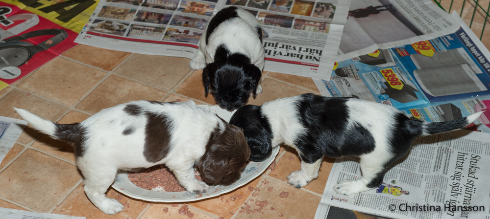 De har börjat få smakportioner och senare även lite större portioner av valpmat, något som uppskattades, även om morsans mjölkbar fortfarande är mest populär.