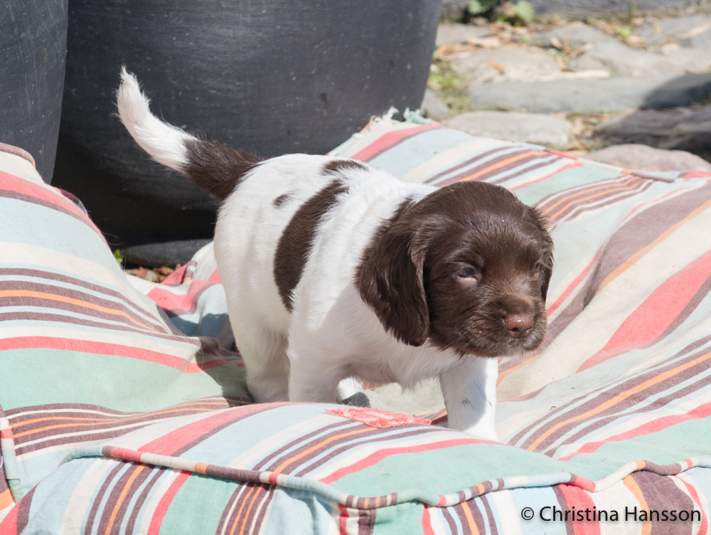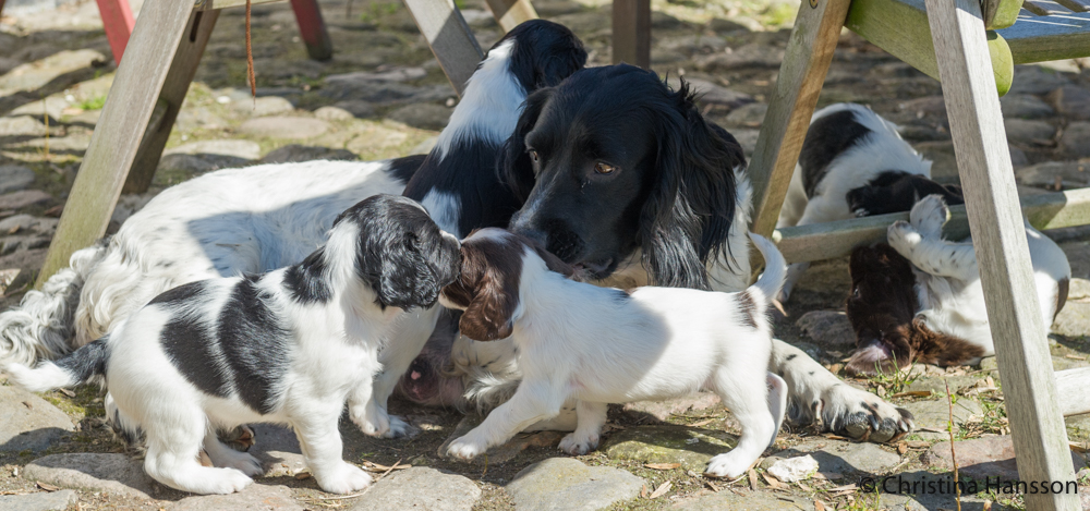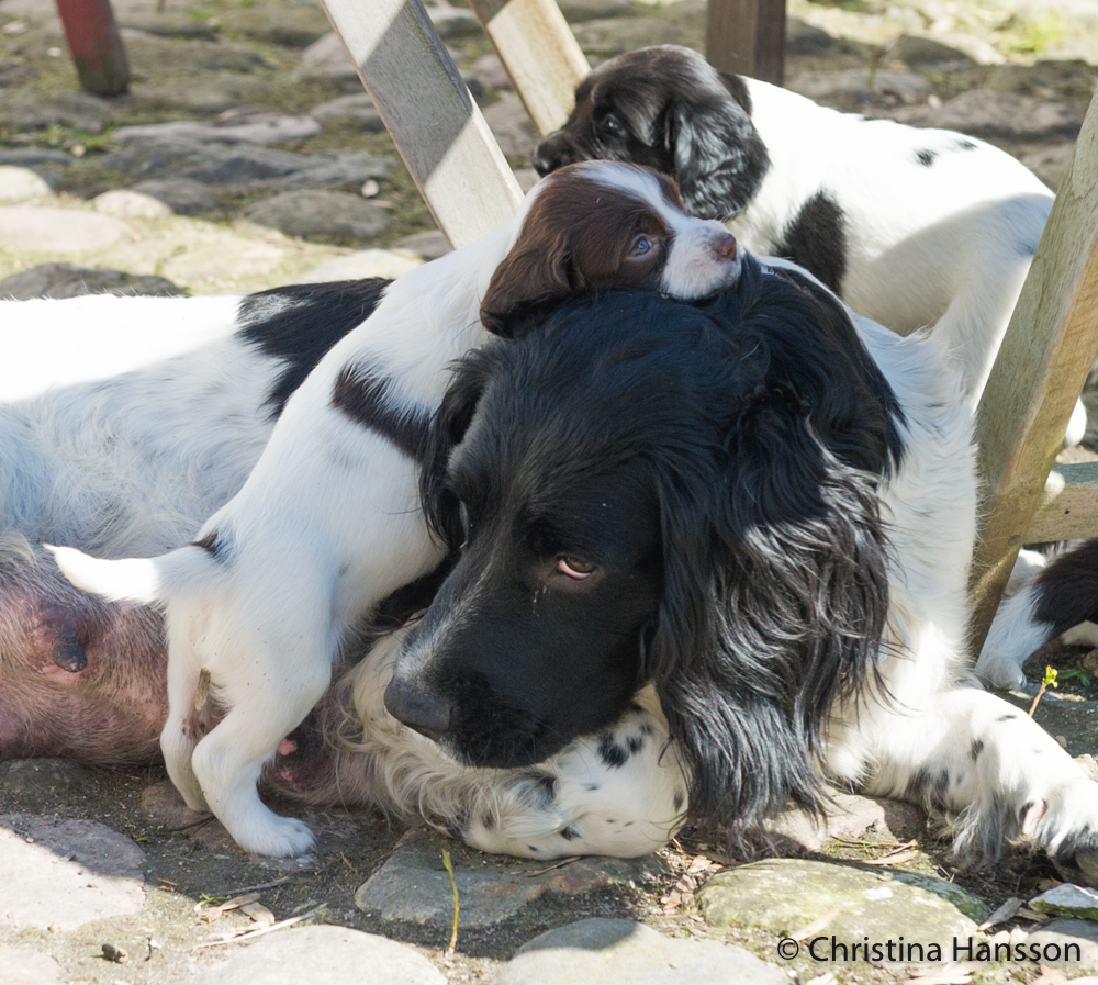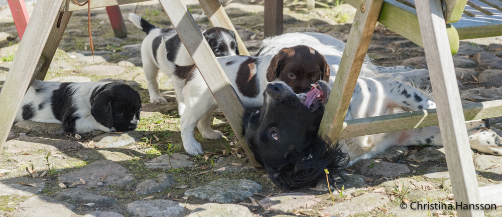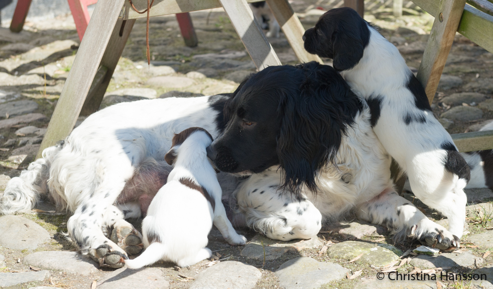 Valparna äter nu uppblött valpfoder ett par gånger om dagen, men mammas mat är fortfarande mest populär. Det är ju viktigt att dricka mycket när det är varmt.