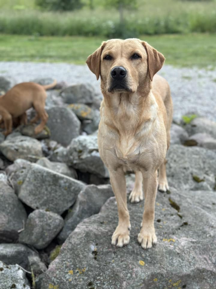 Gnista förväntas löpa i februari 2026, och i denna kull blir troligen alla valpar gula till röda i färgen.