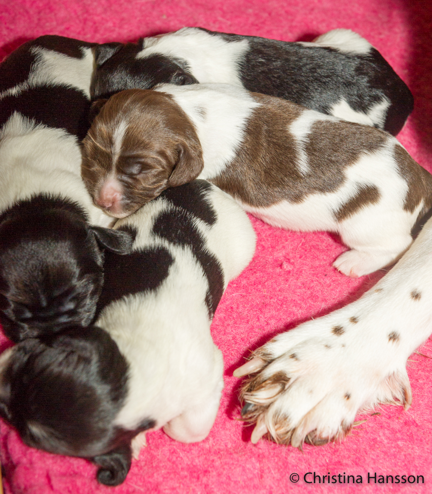 En efterlängtad och väldigt vacker kull med fem finfina töser fick Game idag för två år sedan. Pappa heter DKFTCH SFTCH och dubbel mästerskapsvinnare Flushmore Pepper. En pappa som jag inte hade sett ut åt Game, men som hon såg ut till sig själv!