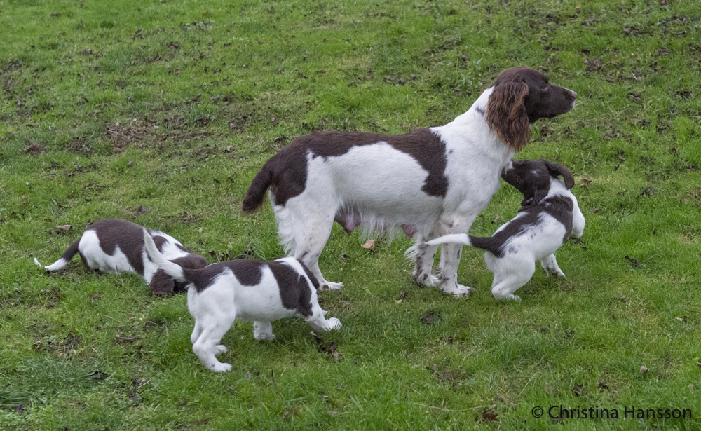 Game fortsätter att vara supermamma och ställer fortfarande upp med lite extra mjölkbar – trots oerhört intensivt diande! UniQs valpfoder står annars på menyn och äts med glupande aptit.