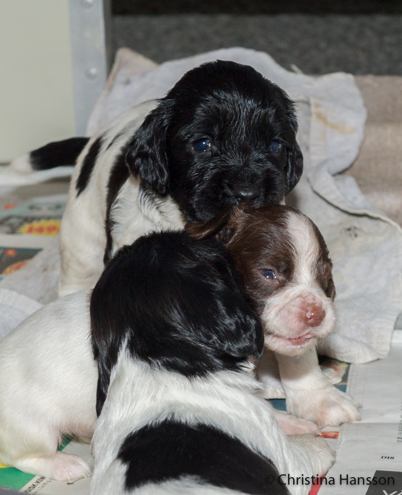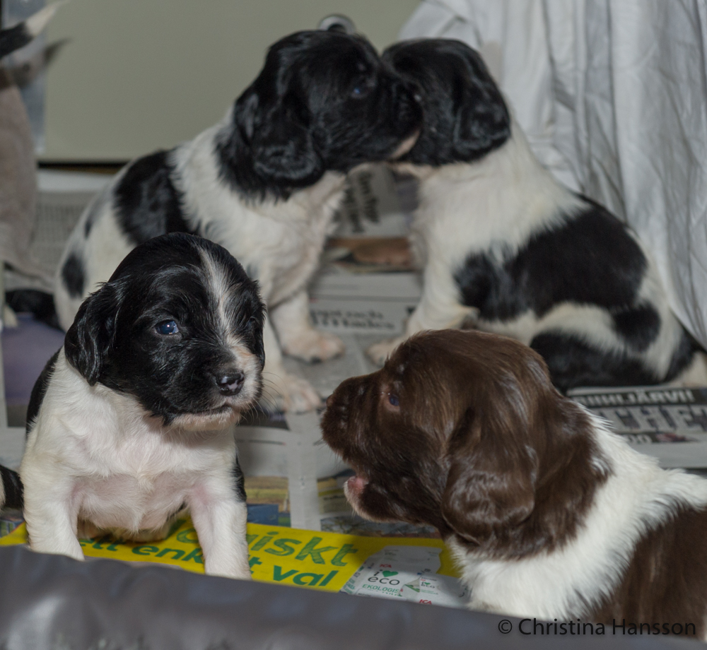 Valparna har nu flera, men fortfarande väldigt korta, vakna stunder och har börjat leka med varandra. En stillsam lek, som så småningom övergår i mer lattjolajbanlek.